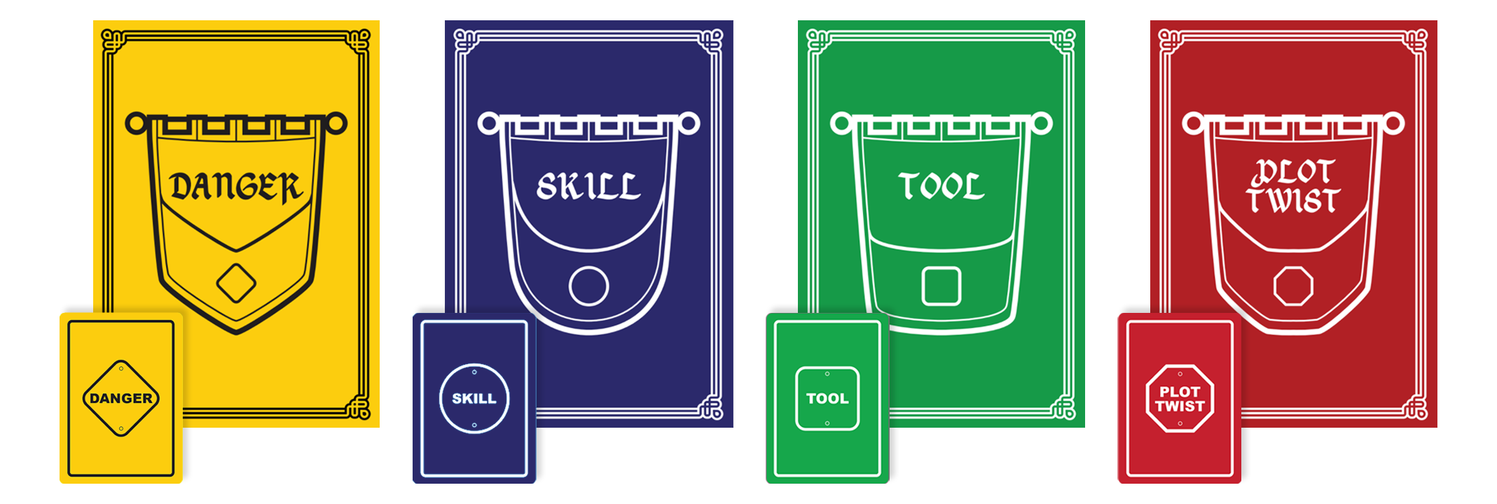 A core component of Mythical Mayhem was to include mechanics inspired by D&D and other roleplaying games for more narrative focused moments. To help push this, the theming was tweaked to incorporate fantasy elements. One such example are the backs of each card, now featuring banner-like designs that are direct references to the base versions.