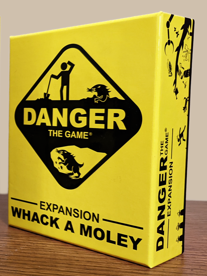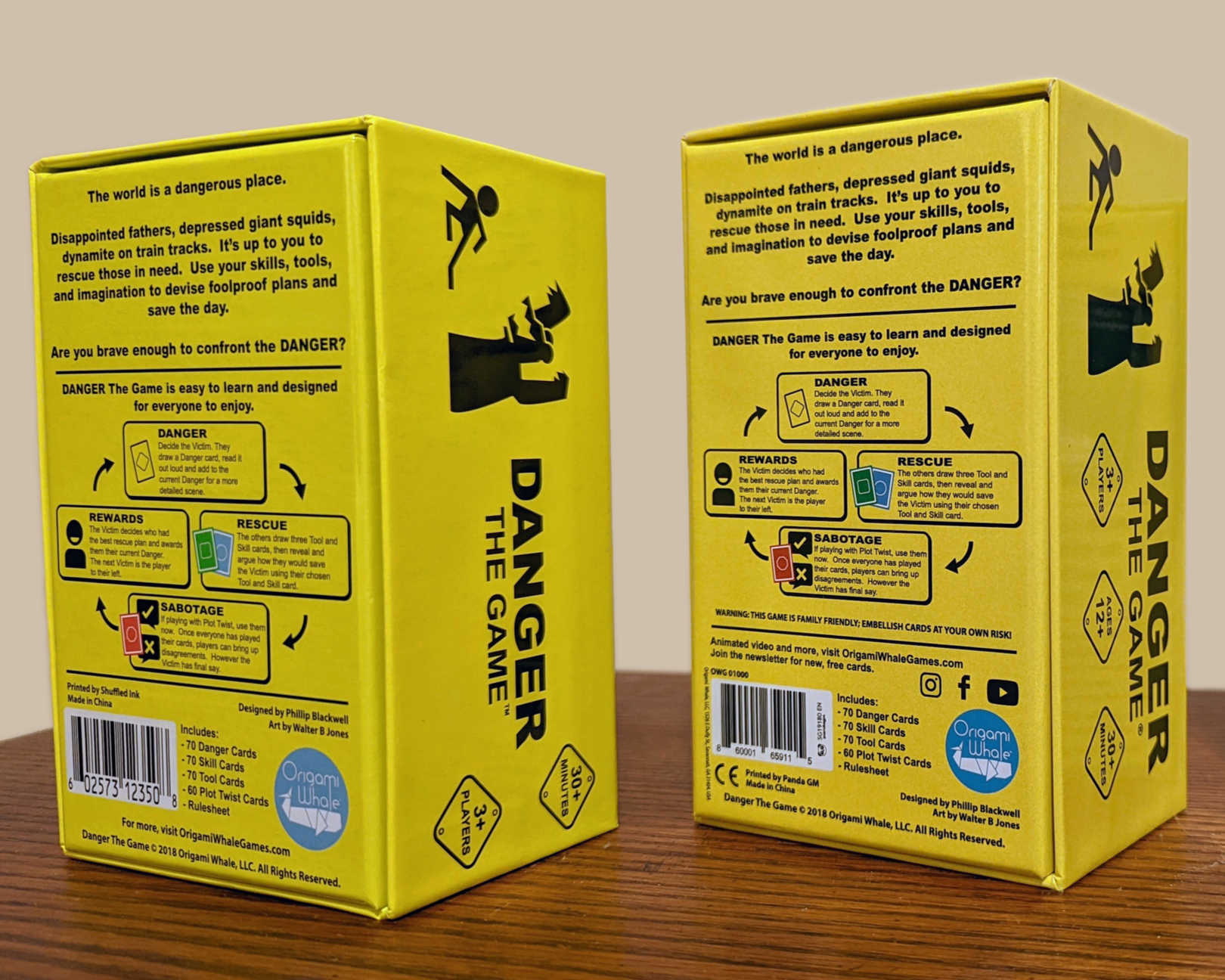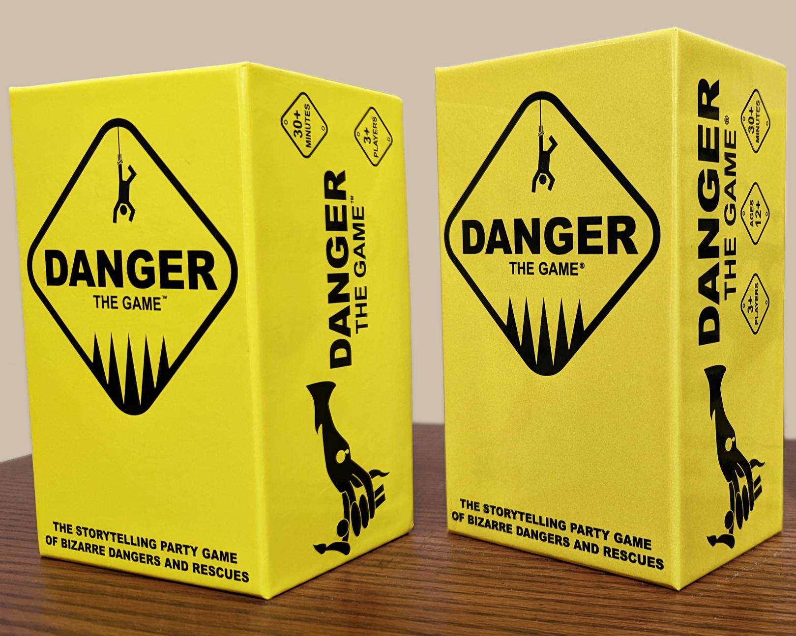 From right to left: The prototype box design for the base edition of Danger The Game, the first print run edition of Danger The Game. I was responsible for the design and layout.