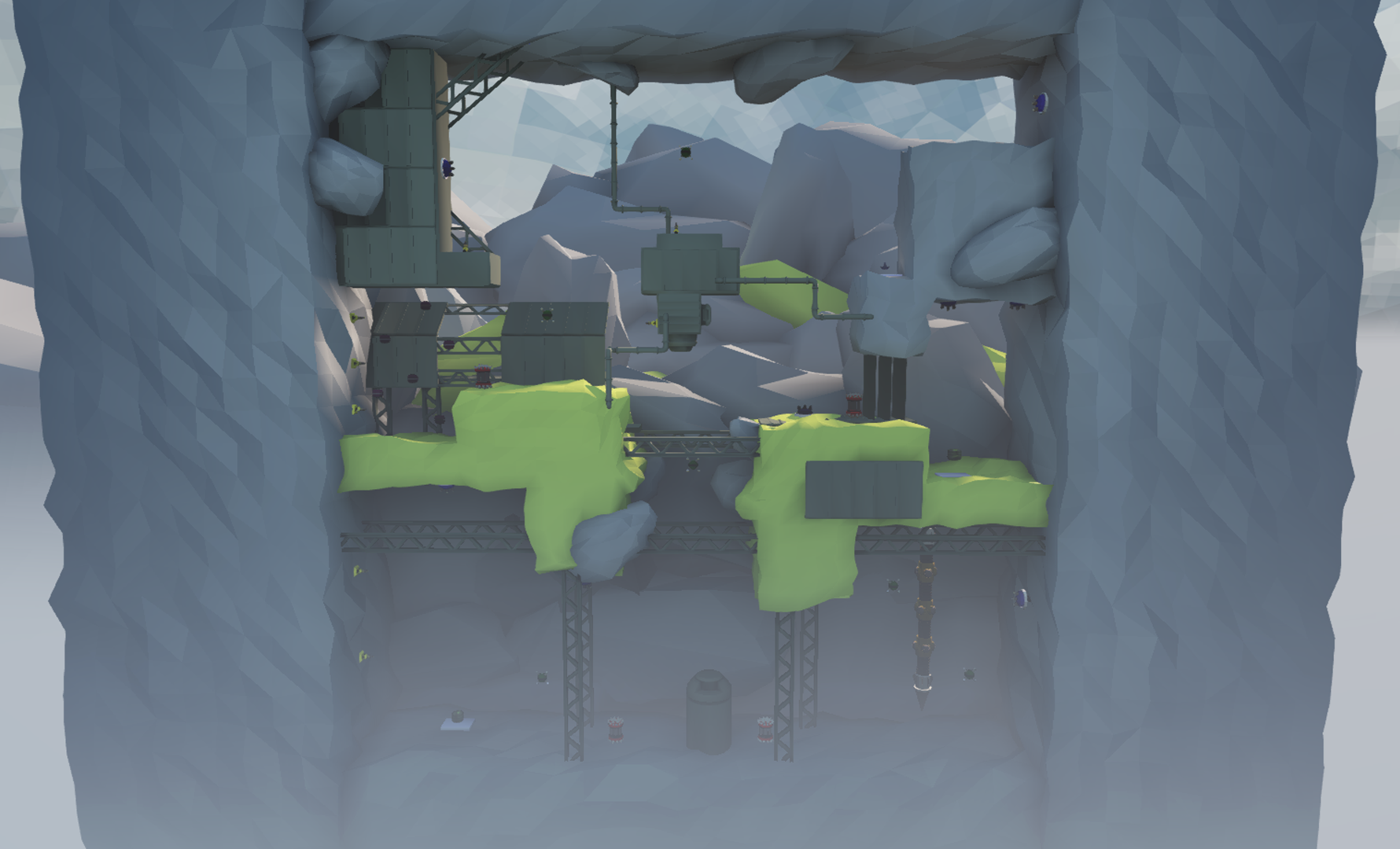 After a few more changes to the layout and enemy patterns, the final level began to take shape. At this stage I was responsible for placing props, additional enemies, updated triggers, and overall lighting. A foggy haze was also added to push the lower half’s feeling of being underground compared to the top half of the level.