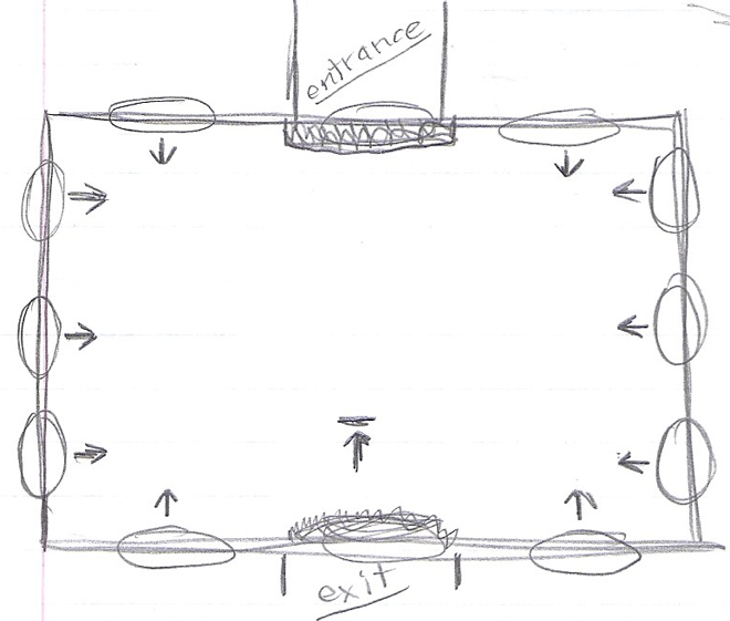 The player would spawn near the top right corner of the screen and be tasked with travelling to the left and to activate a switch protected by enemies. This switch would begin the process of opening three hatches located to the right of the screen.