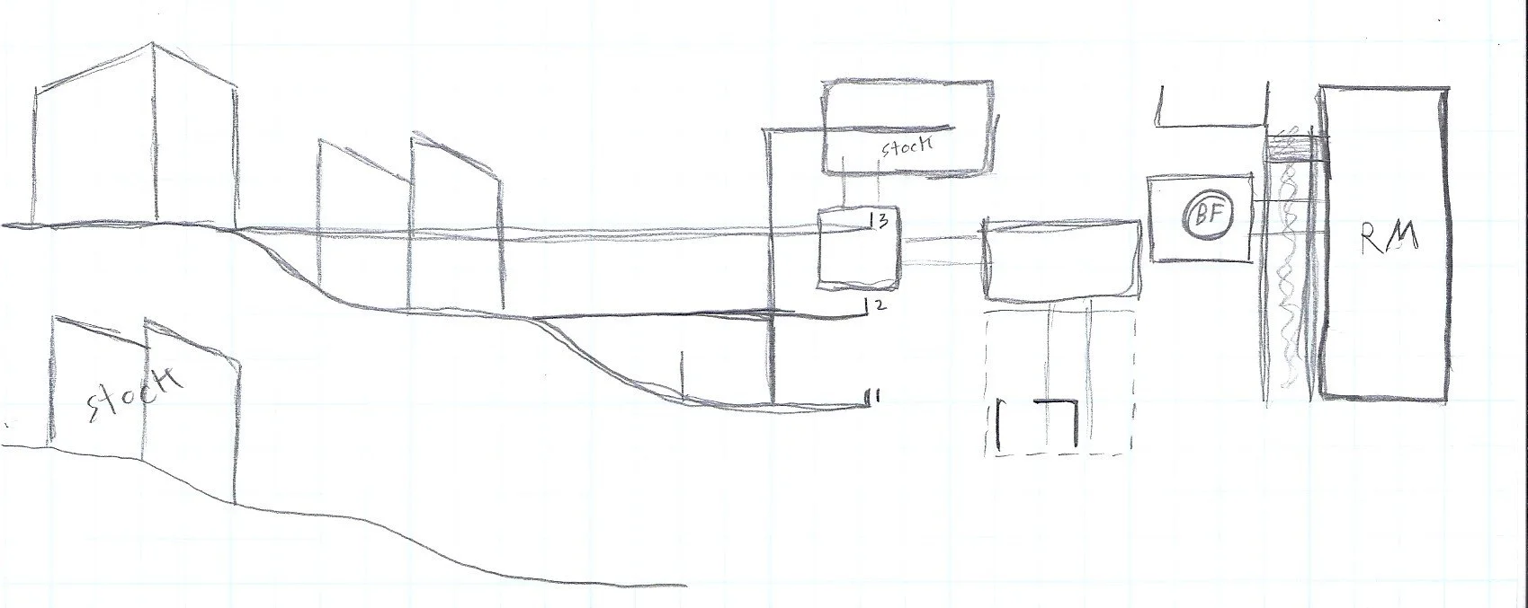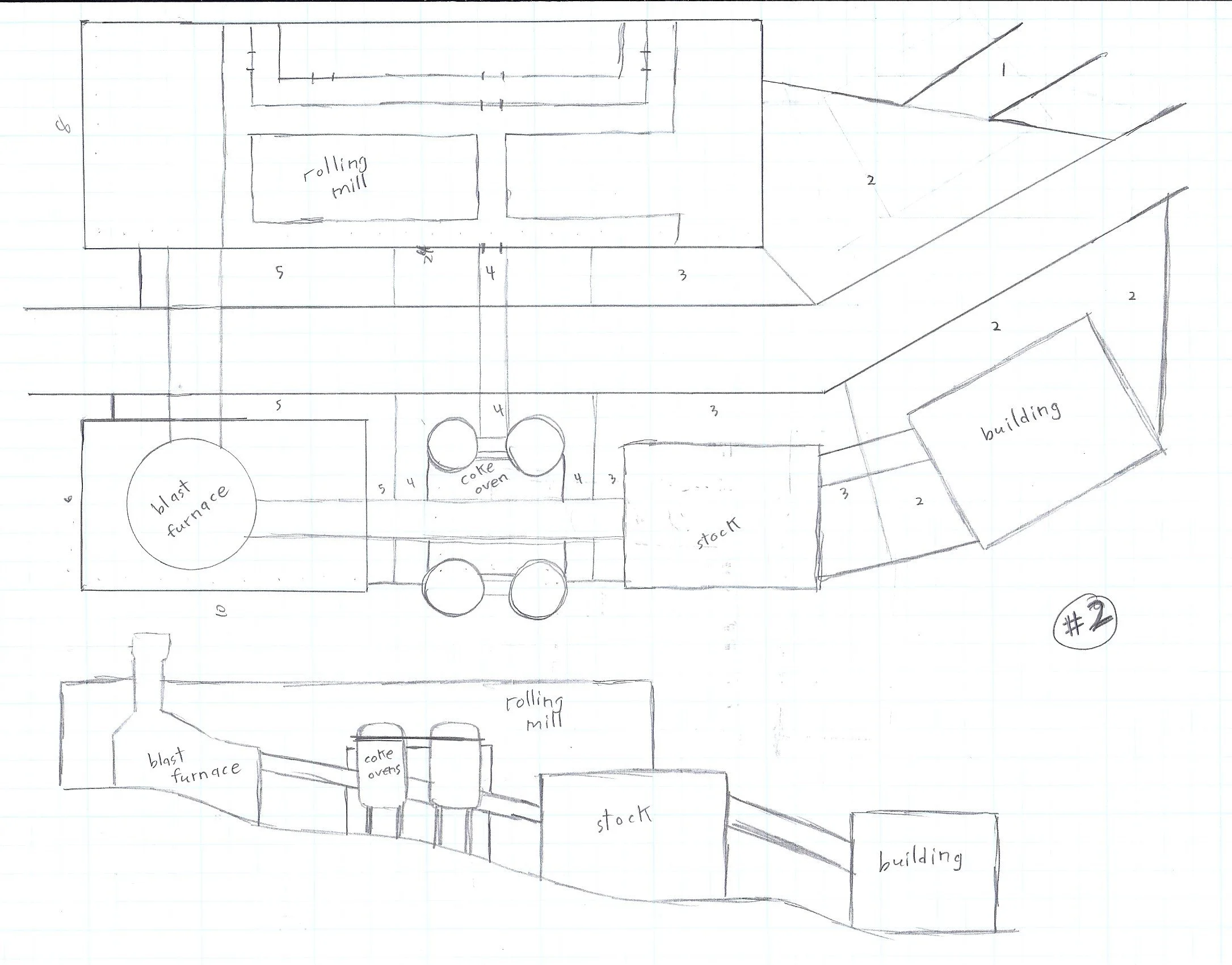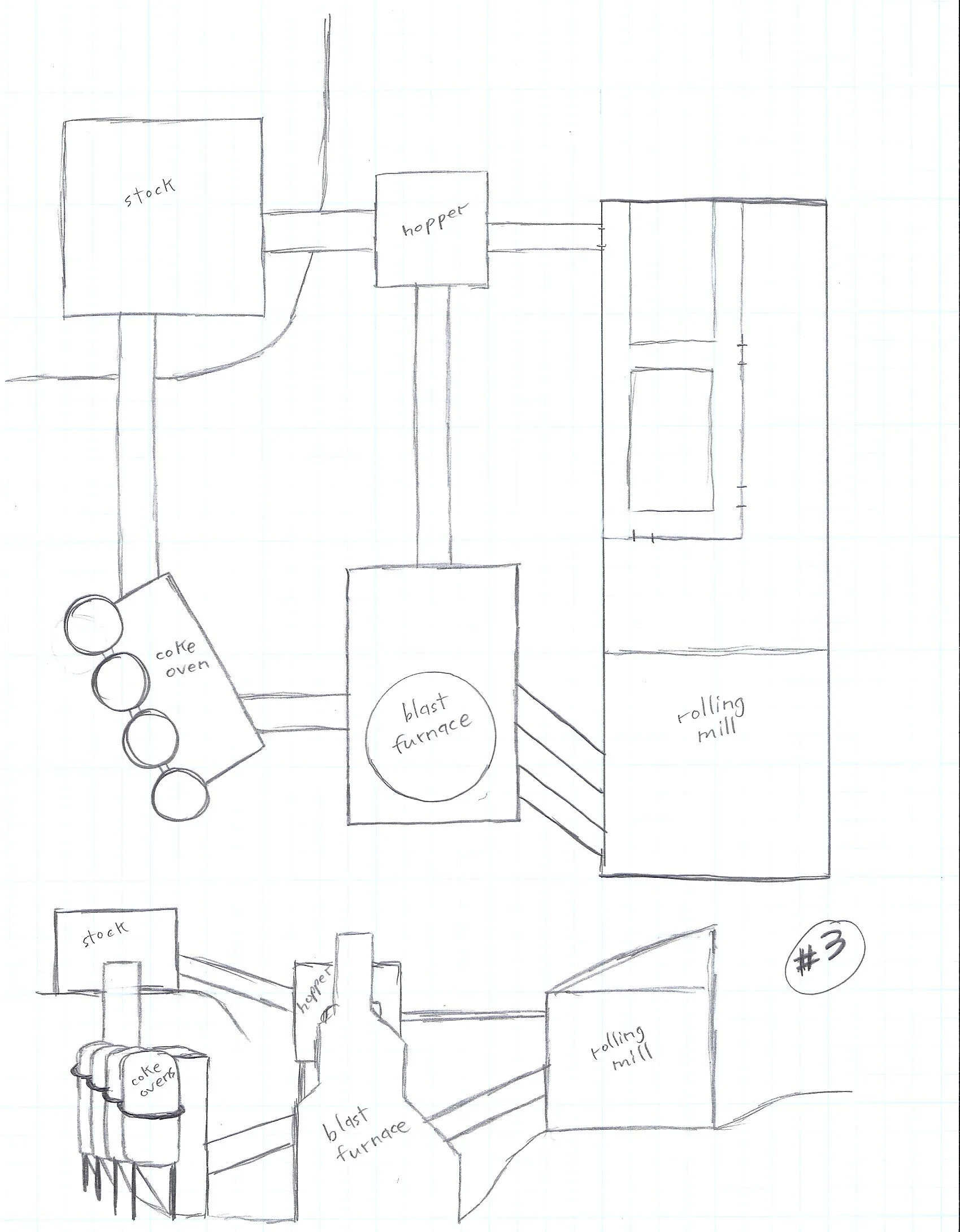 With a better understanding of what to expect in mill environments, I started drafting possible level layouts. With each I aimed to incorporate the structures as they might realistically be positioned, keeping in mind we needed players to navigate between them. One defining feature I wanted to include was a river running through the middle of the area, possibly used to hydroelectrically power the mill. For sketch #1, the mill was built directly over the river, with it being rerouted through tunnels underneath. Sketch #2 was directly based on my original blockout as the river was much more obvious and gave me the chance to incorporate it more into the player’s path. The final sketch was a bit different as the river was removed, but placed each section on drastically different elevated areas with the idea of using the interconnecting conveyers as the main path throughout.