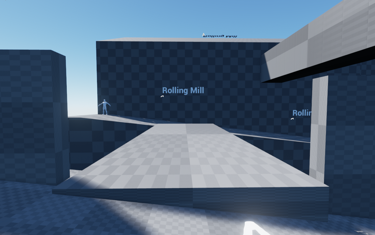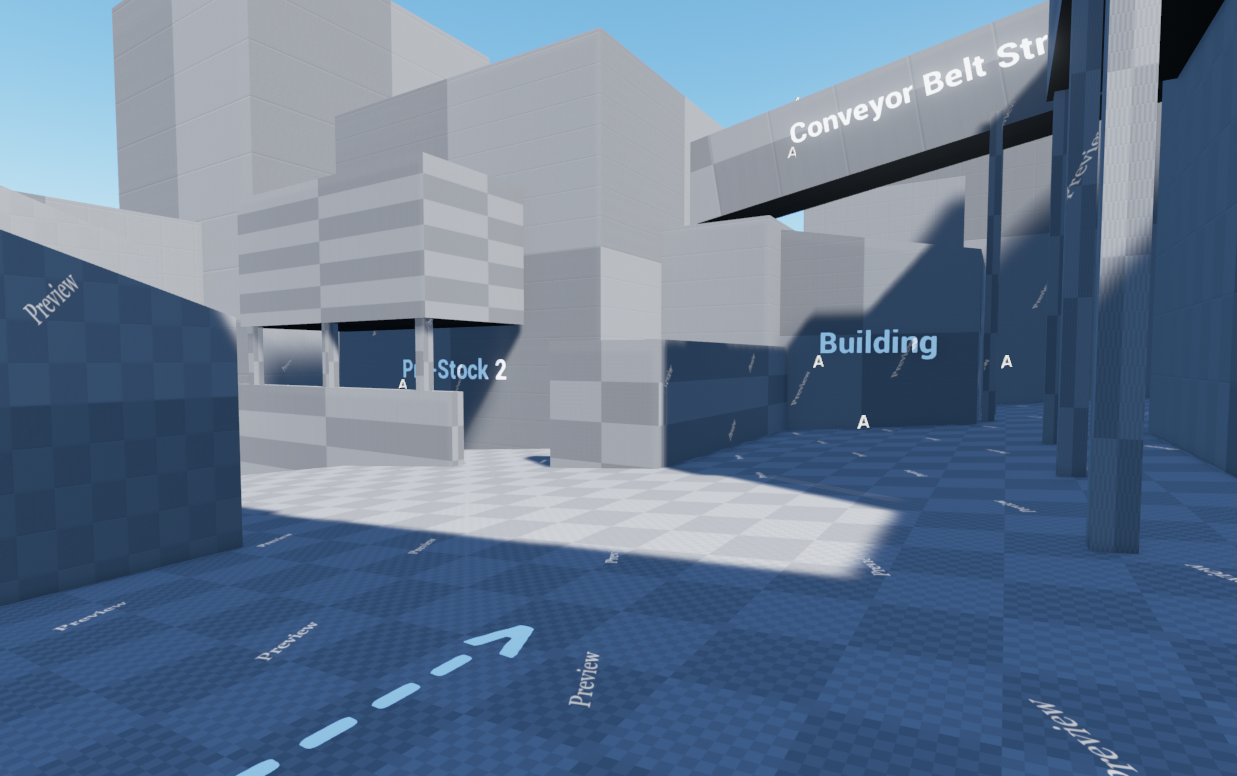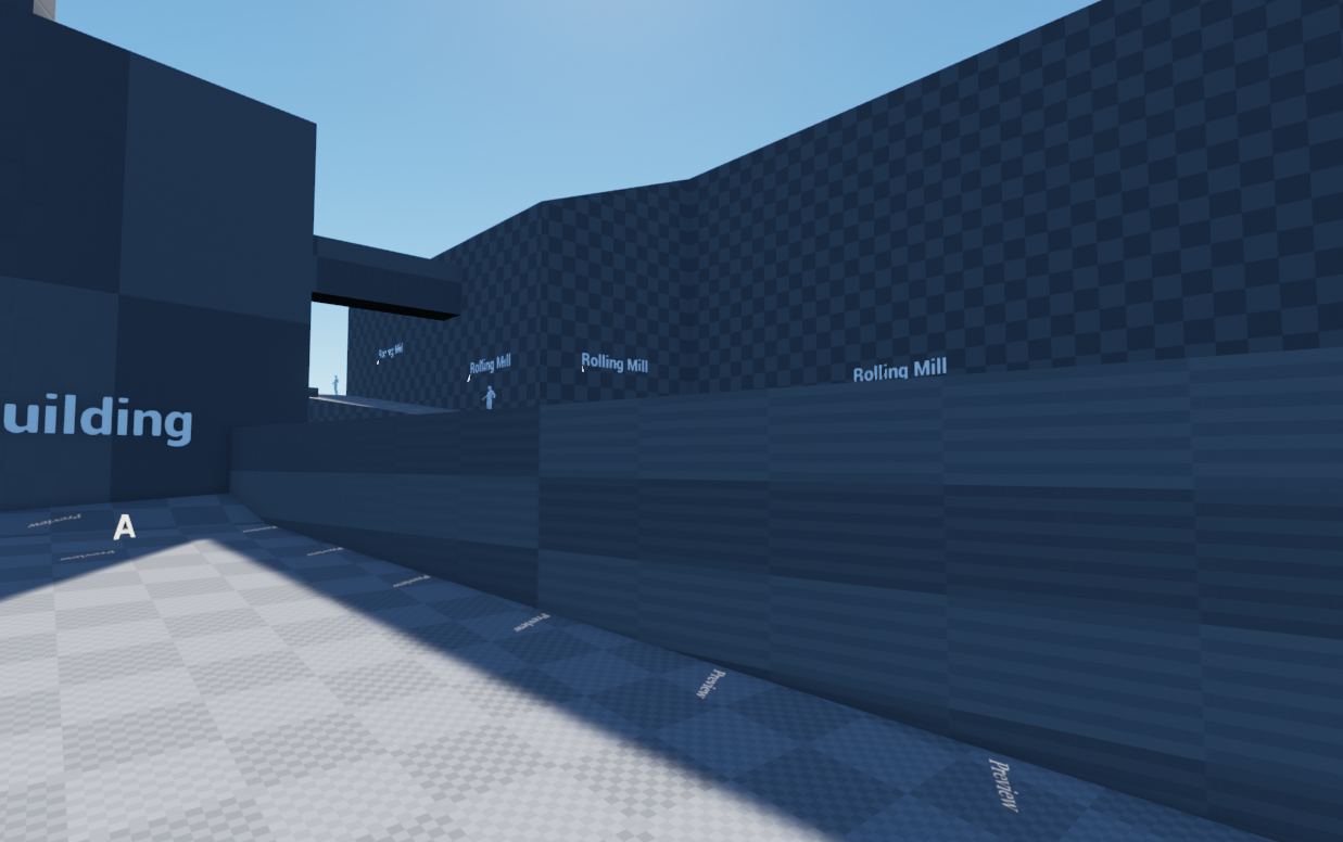With the level layout ready, I began blocking out the main locations the player would visit. This also helped to determine pacing throughout the game and gave us more info on how to incorporate the key moments we wanted. While many of these areas did make it into the alpha, the full path had to be cut in half due to a lack of usable props/assets and time constraints. This unfortunately resulted in a handful of encounters being cut, including a complete rework of the inside of the sintering plant, turning the proposed maze like interior into a single hallway.