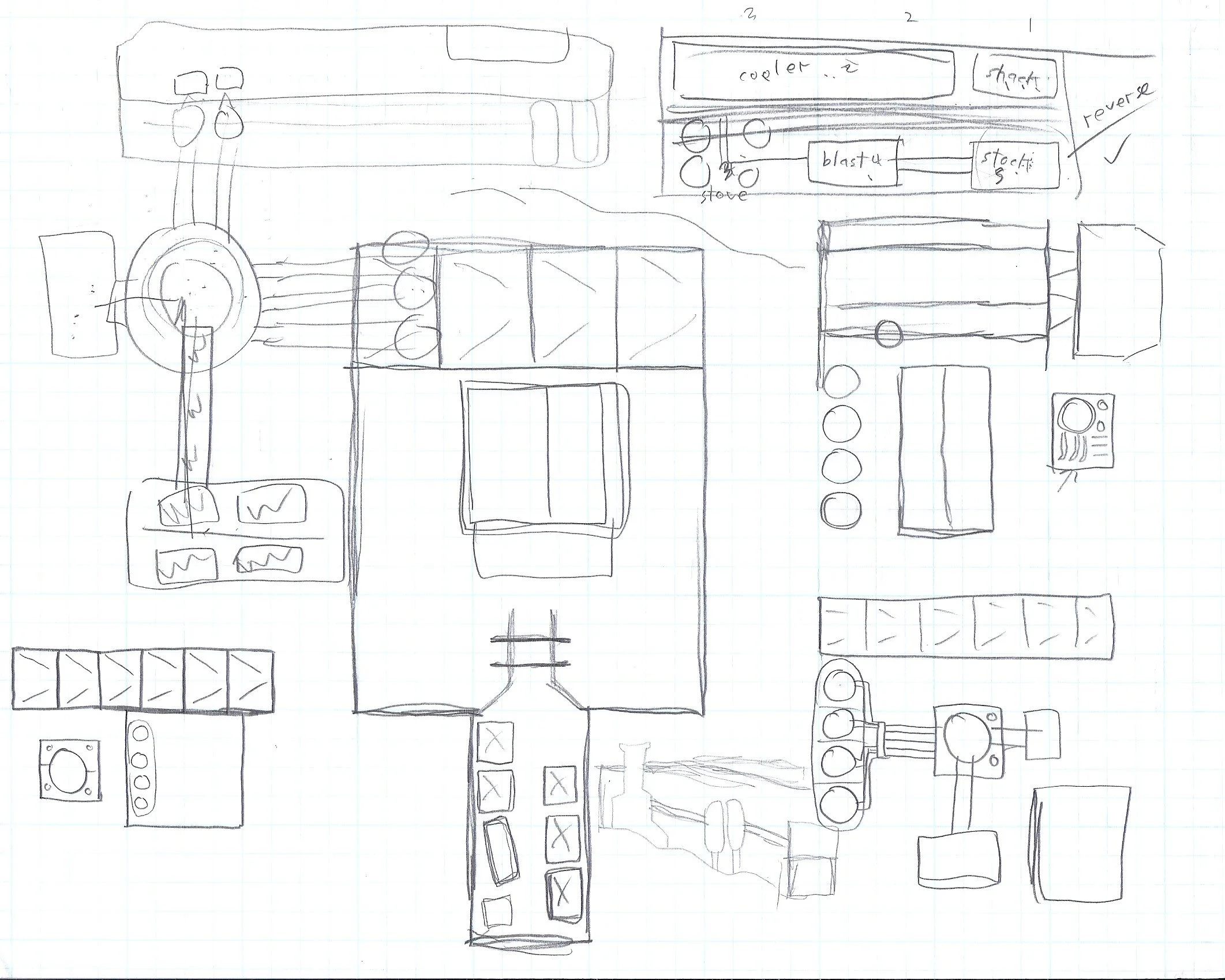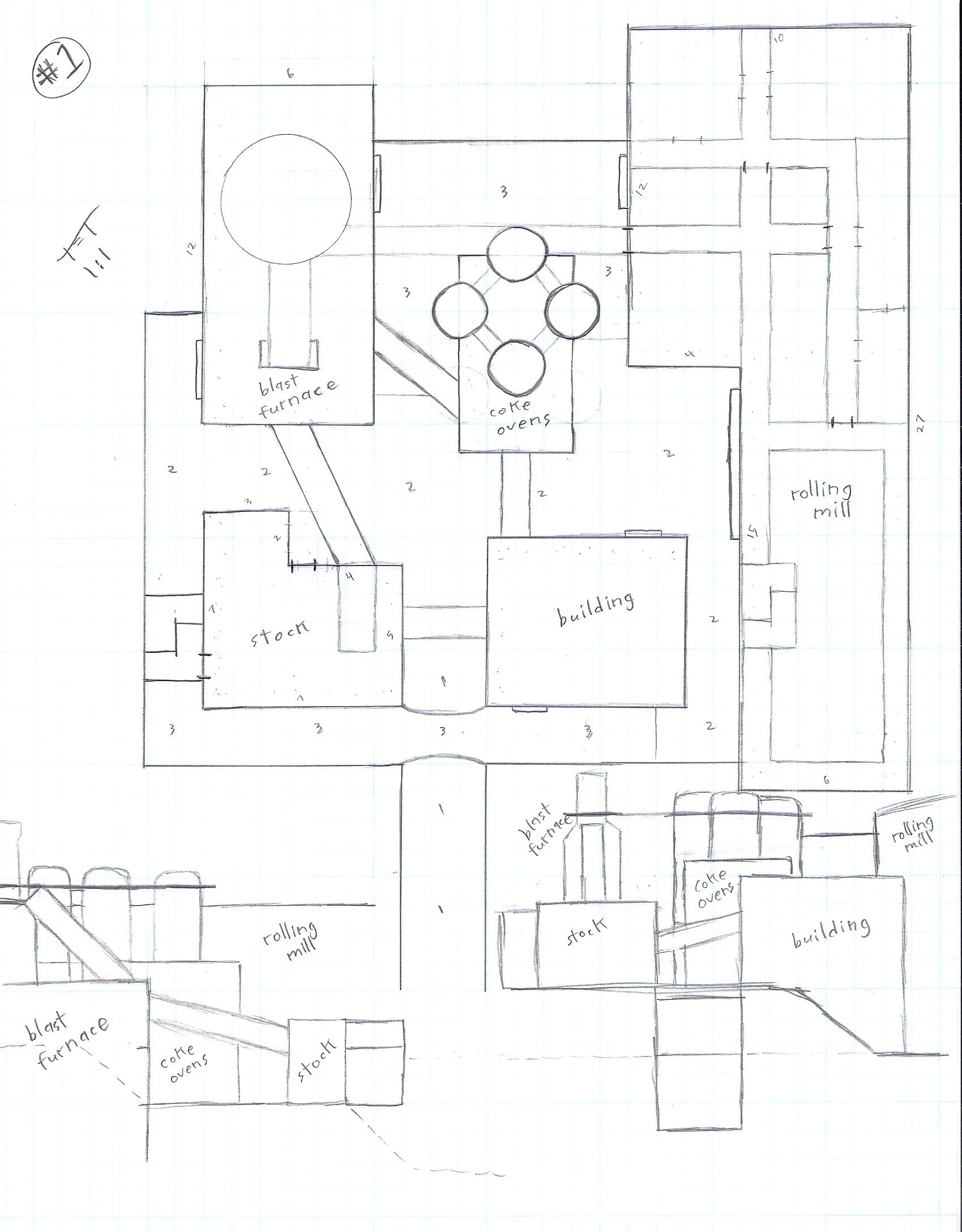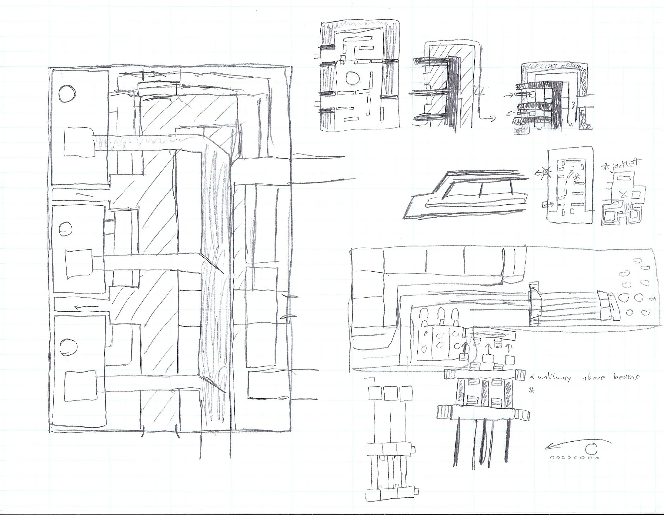 As I progressed in my research, I started sketching layouts based on blueprints and photos I found of the interiors of some structures. This also helped when making a quick blockout to further visualize how the buildings linked up and how I could properly utilize these spaces.