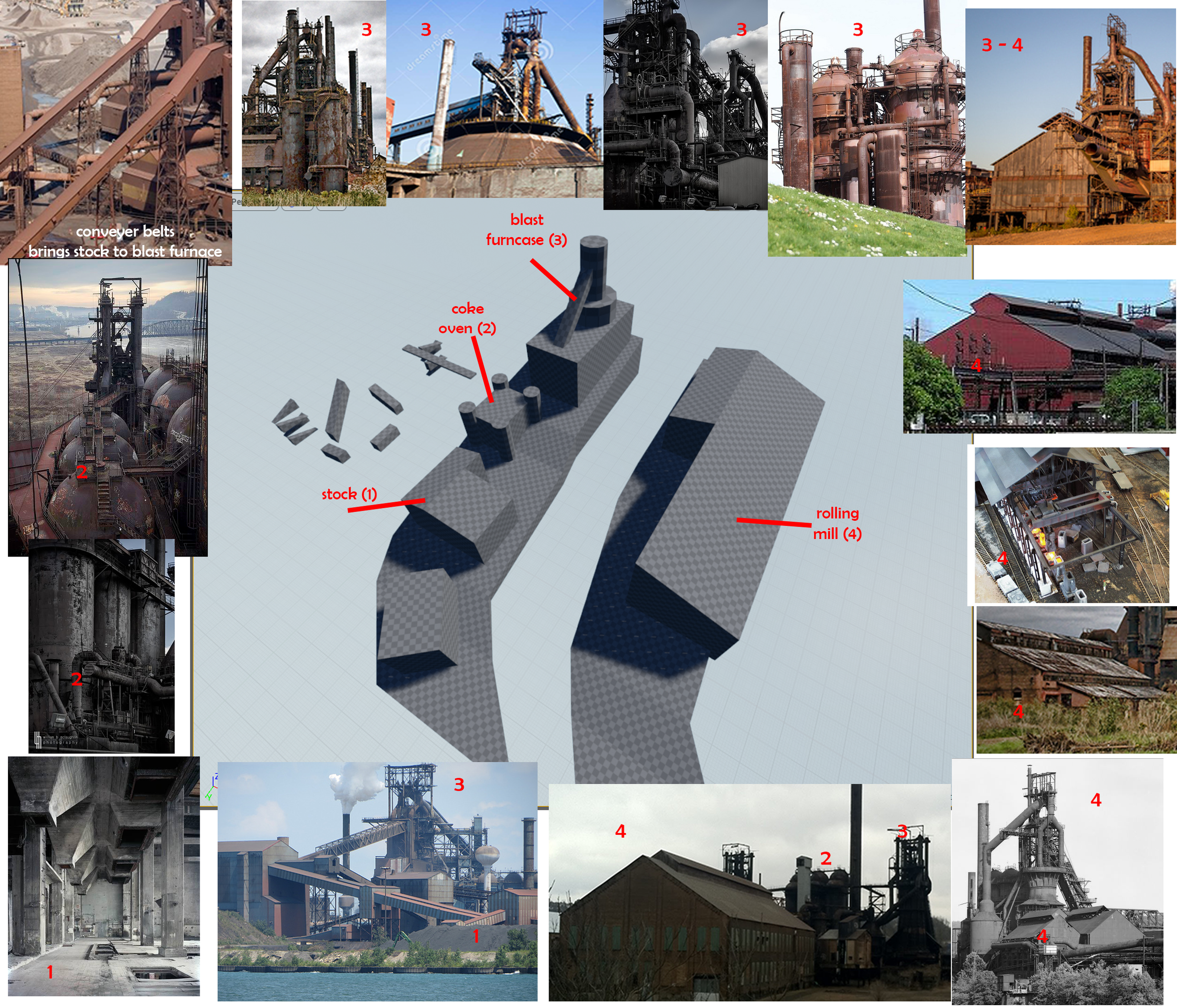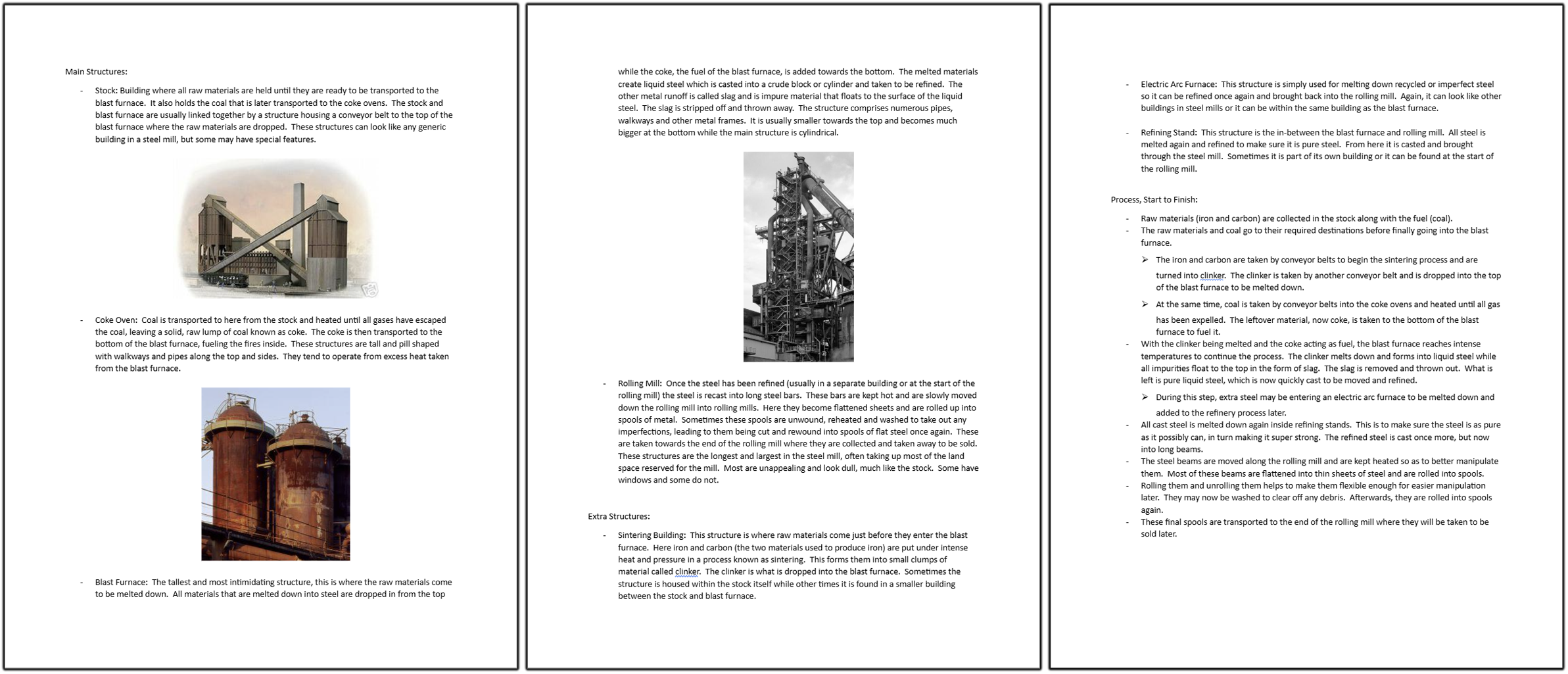 The team lead’s experiences in northern Europe helped to better establish our setting and I began researching similar places in the region. This led me to creating a document that broke down each step in the metal making process and their related buildings or structures.