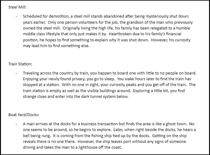 At this time in development, I started filling out the environment with the available assets and even assisted with sound design for noises and dialogue. I also began work on blueprints for specific triggered moments, involving the use of lights, the aforementioned sounds, and movement of props.